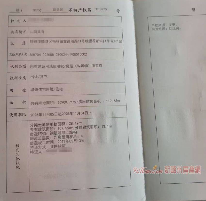 - 贛縣贛鋁花都(帶獨家露臺)住房3室2廳2衛(wèi)120平米,第4層(共6層),如圖右上。有不動產(chǎn)權(quán)證剛辦好。房子周圍大概有200平露臺(露臺下是店鋪),可種花種草,運動, 好曬太陽,下面還有柴間7.93平米,路臺上還有一間10平米左右小房間,門口是贛縣城關(guān)四小、中學(xué),擬71萬出售,心誠價格可協(xié)商。